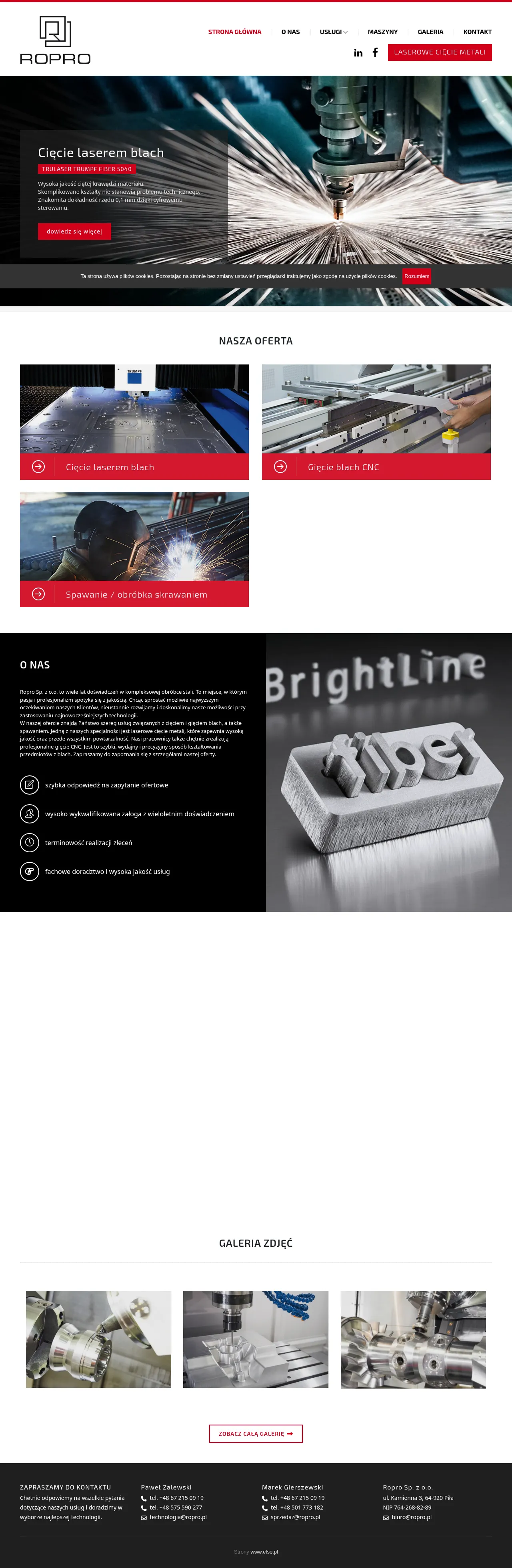 Ropro Sp. z o.o. is a manufacturing company specializing in comprehensive metal processing services. Their primary capabilities include CNC laser cutting, press brake bending, precision welding, and mechanical machining. The firm utilizes advanced, numerically controlled equipment to ensure high repeatability and accuracy across various metal components. They serve a wide range of industrial applications, offering solutions that combine technical precision with efficient material utilization. With a focus on quality and reliability, the company provides expert support from project initiation to final product delivery.