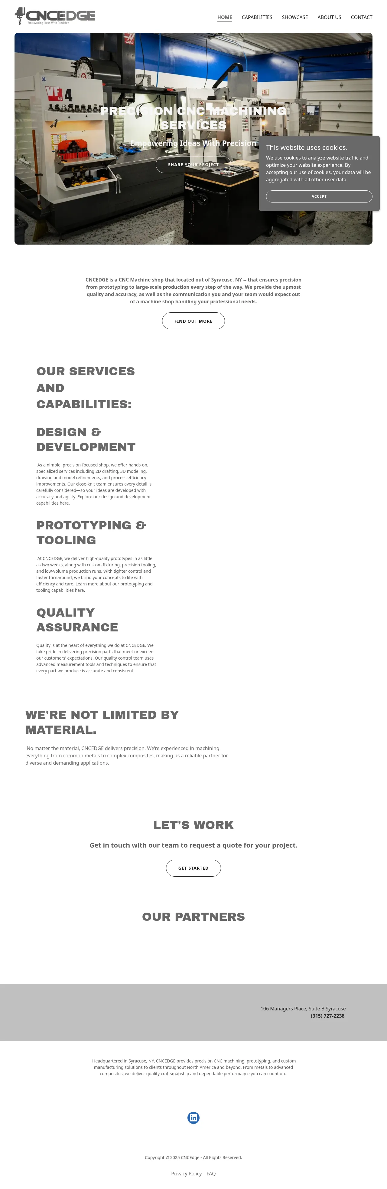 CNCEdge is a precision machine shop located in Syracuse, New York, specializing in CNC manufacturing solutions. The company provides a range of services from initial prototyping to small-to-medium scale production runs. Committed to quality and on-time delivery, they support clients across various industrial sectors with tailored machining requirements. Their workflow emphasizes rigorous quality assurance and clear communication throughout the production lifecycle. They offer expedited services to accommodate urgent project deadlines and fluctuating manufacturing demands.