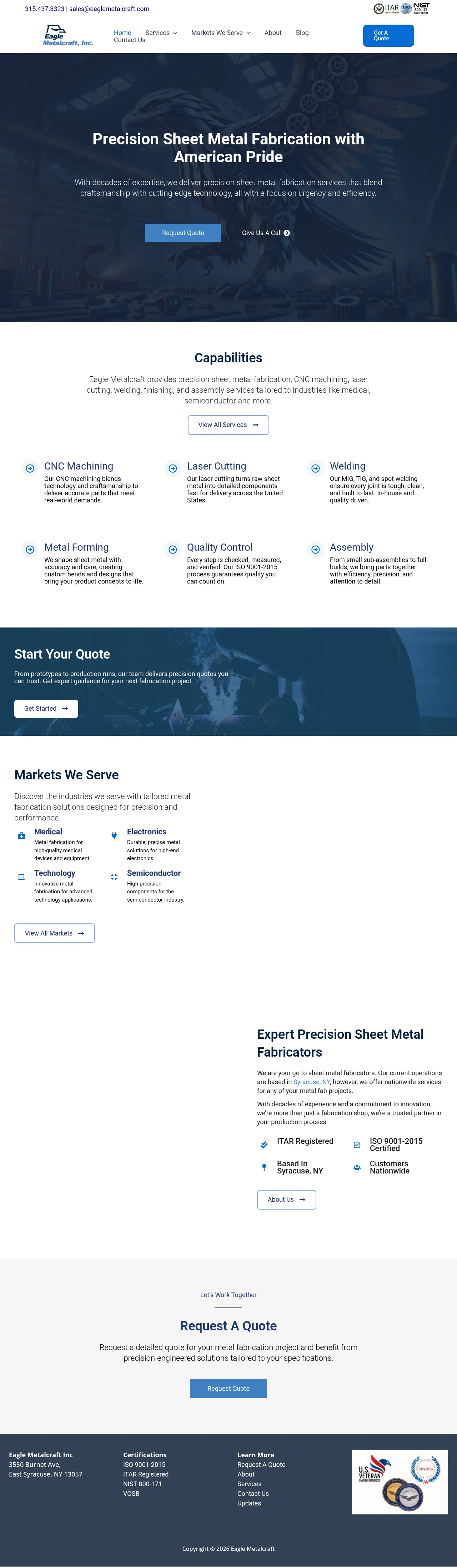 Eagle Metalcraft is a precision sheet metal fabrication provider based in Syracuse, New York. The company offers a comprehensive range of services including CNC machining, laser cutting, welding, and assembly for clients across the medical, semiconductor, electronics, and technology sectors. With a focus on both prototyping and production runs, the firm combines traditional craftsmanship with modern manufacturing technology. They operate under a strict quality management system to ensure high-performance outcomes for complex technical applications. Recognized as a veteran-owned business, the company serves a nationwide client base with an emphasis on efficiency and engineering precision.