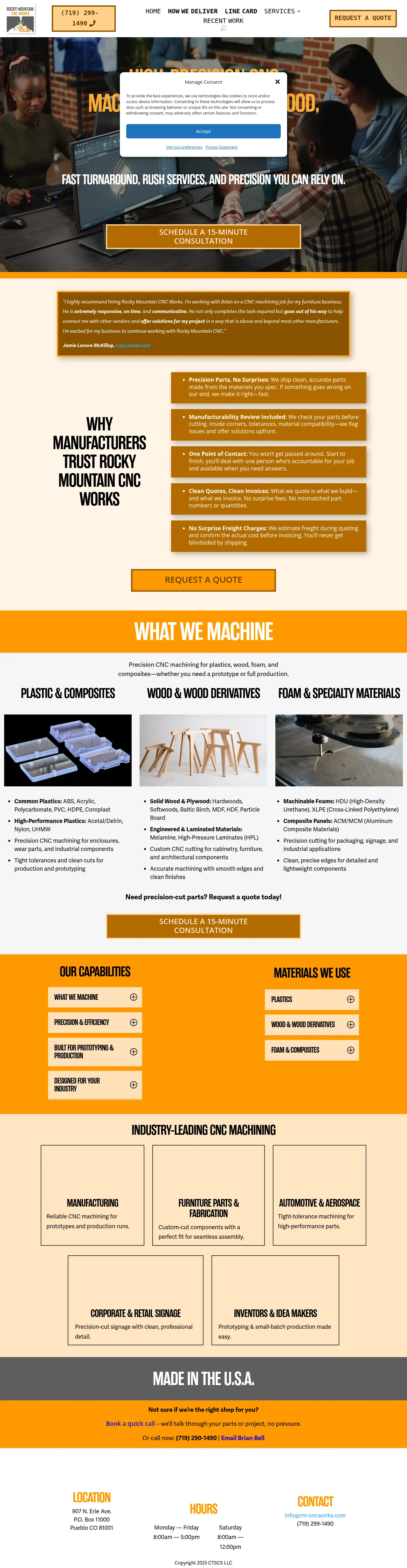 Rocky Mountain CNC Works provides precision CNC machining for plastics, wood, foam and composite materials. The company handles both prototyping and production runs, delivering tight-tolerance parts and precision-cut components for assembly. They support expedited work and short turnaround projects.