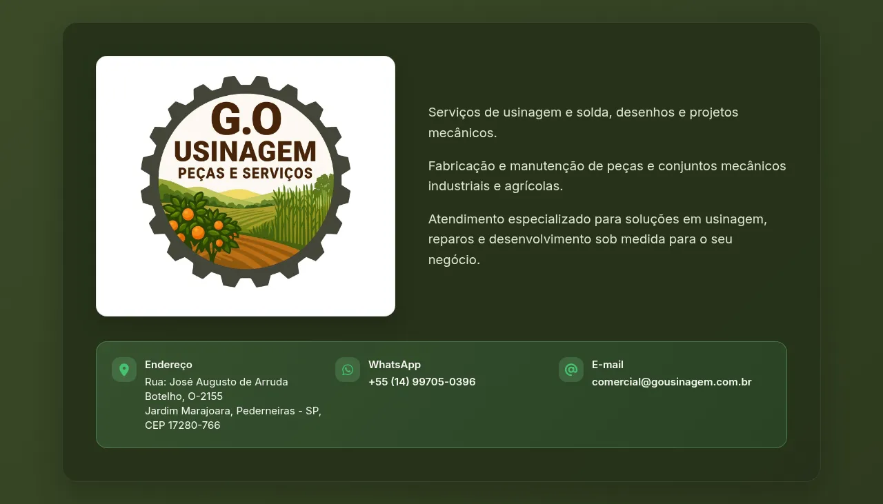G.O Usinagem provides specialized machining, welding, and mechanical engineering services. The company focuses on the fabrication and maintenance of mechanical parts and assemblies tailored for industrial and agricultural applications. Capabilities include technical drafting and the development of custom mechanical projects. By offering precise machining solutions and repair services, the business supports the operational requirements of its clients. The company is committed to delivering custom-engineered results through professional technical support and reliable manufacturing processes.