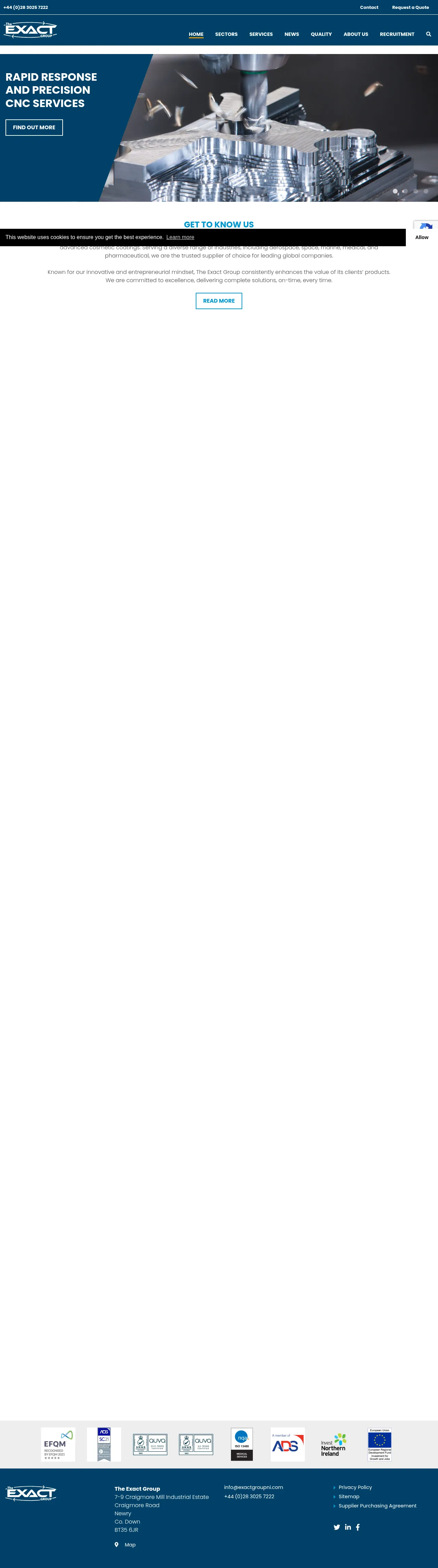 The Exact Group is a precision engineering and finishing company based in Newry, Northern Ireland, operating from a 72,000 sq ft facility. They specialize in CNC milling, CNC turning, metal fabrication, and cosmetic coating services, including Cerakote application. The company serves demanding industries such as aerospace, defense, medical, pharmaceutical, and power generation. Known for their rapid response capabilities, they maintain high-quality standards through a robust management system and advanced inspection technology. They are recognized for their commitment to excellence through various industry accreditations and a culture of continuous professional development.