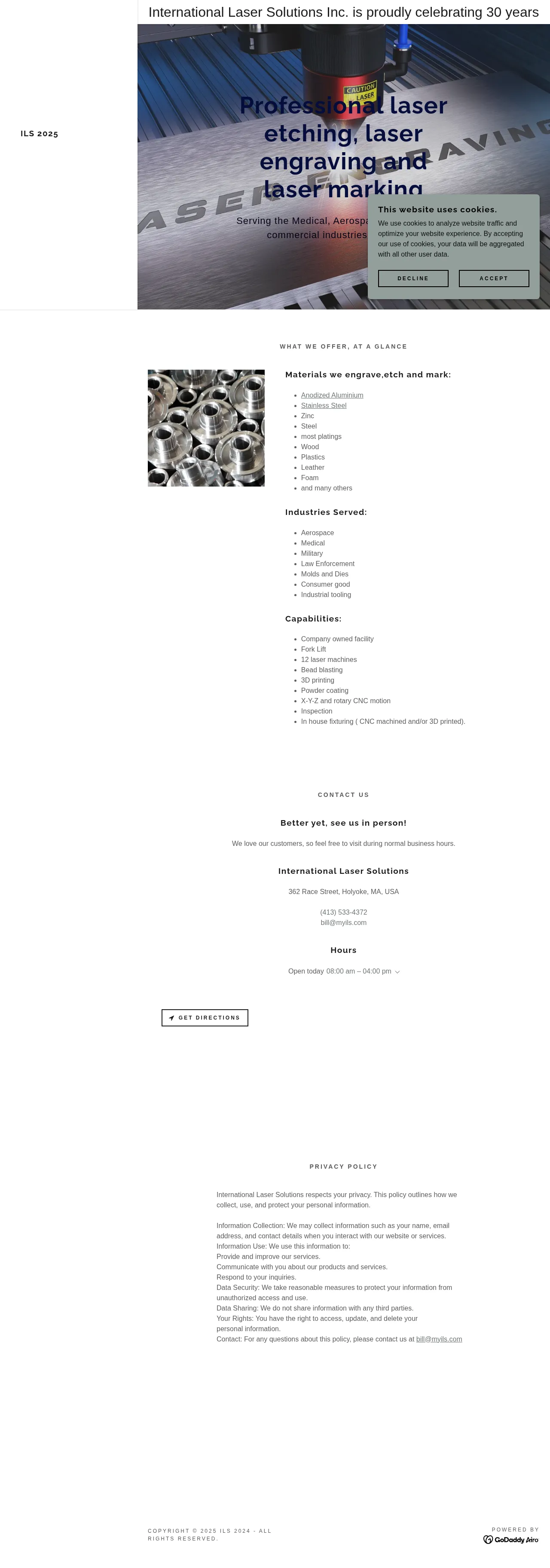 Established in 1995, International Laser Solutions Inc. provides comprehensive laser etching, engraving, and marking services from its dedicated facility. The company supports a diverse range of sectors, including the aerospace, medical, industrial, and commercial industries. Their expertise encompasses both precision black marking and deep engraving processes to meet specific technical requirements. With a focus on quality and versatility, they offer additional in-house support services such as fixturing and component finishing. The firm leverages a robust fleet of laser machinery to deliver reliable manufacturing solutions for varied project needs.