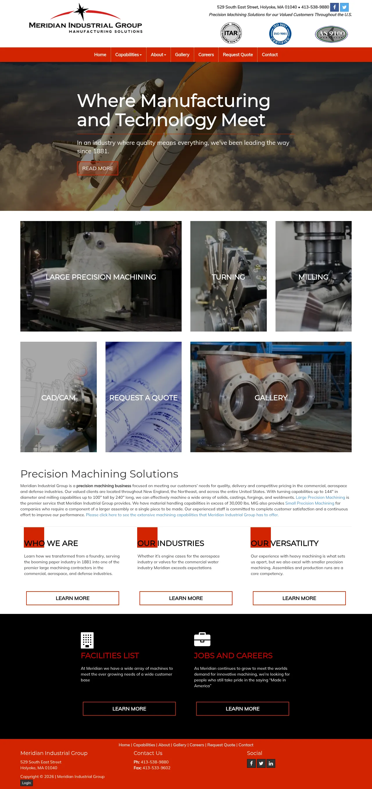 Meridian Industrial Group is a premier precision machining contractor established in 1881, providing services to the commercial, aerospace, and defense industries. The company specializes in both heavy and small precision machining, offering expertise in CNC turning, milling, and CAD/CAM programming. Headquartered in Holyoke, Massachusetts, they support clients across the United States with capabilities ranging from prototyping to large-scale production runs. Their facility utilizes advanced technology to produce complex components such as valves, vacuum chambers, and engine cases. With a deep commitment to quality control, the firm maintains rigorous industry standards for all manufactured parts.