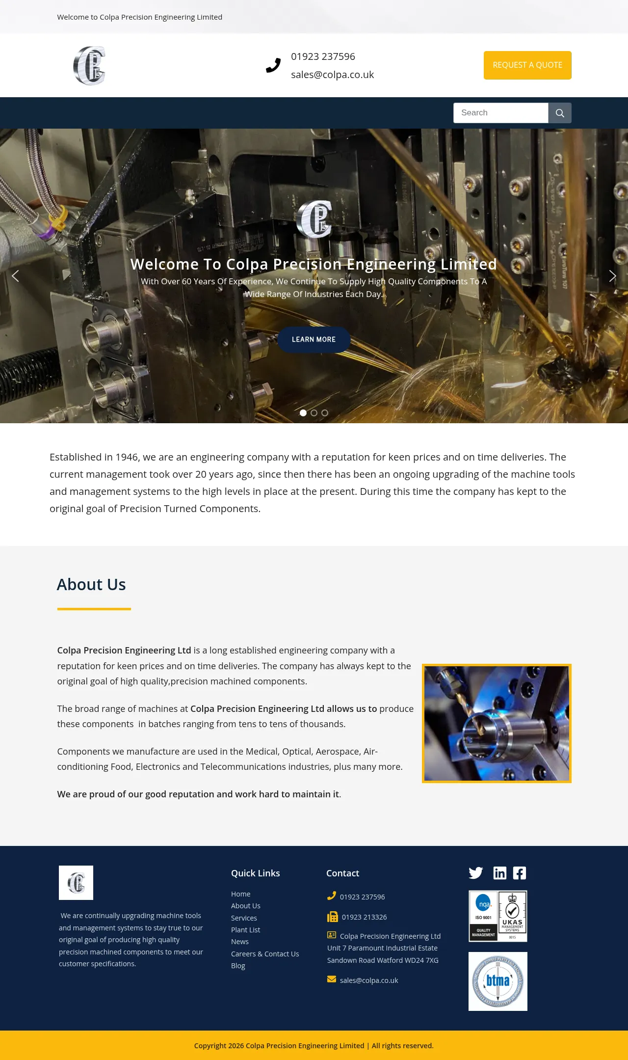 Colpa Precision Engineering Limited is a precision manufacturing firm established in 1946 with over six decades of industry experience. The company specializes in the production of precision turned components, serving a diverse array of sectors including aerospace, military, medical, optical, and telecommunications. Through continuous investment in modern machinery and management systems, the firm maintains high standards for component quality and delivery reliability. Colpa Precision prioritizes long-term client relationships by focusing on manufacturing accuracy and efficient production processes. Their operations are centrally located in Watford to support a wide range of industrial manufacturing requirements.