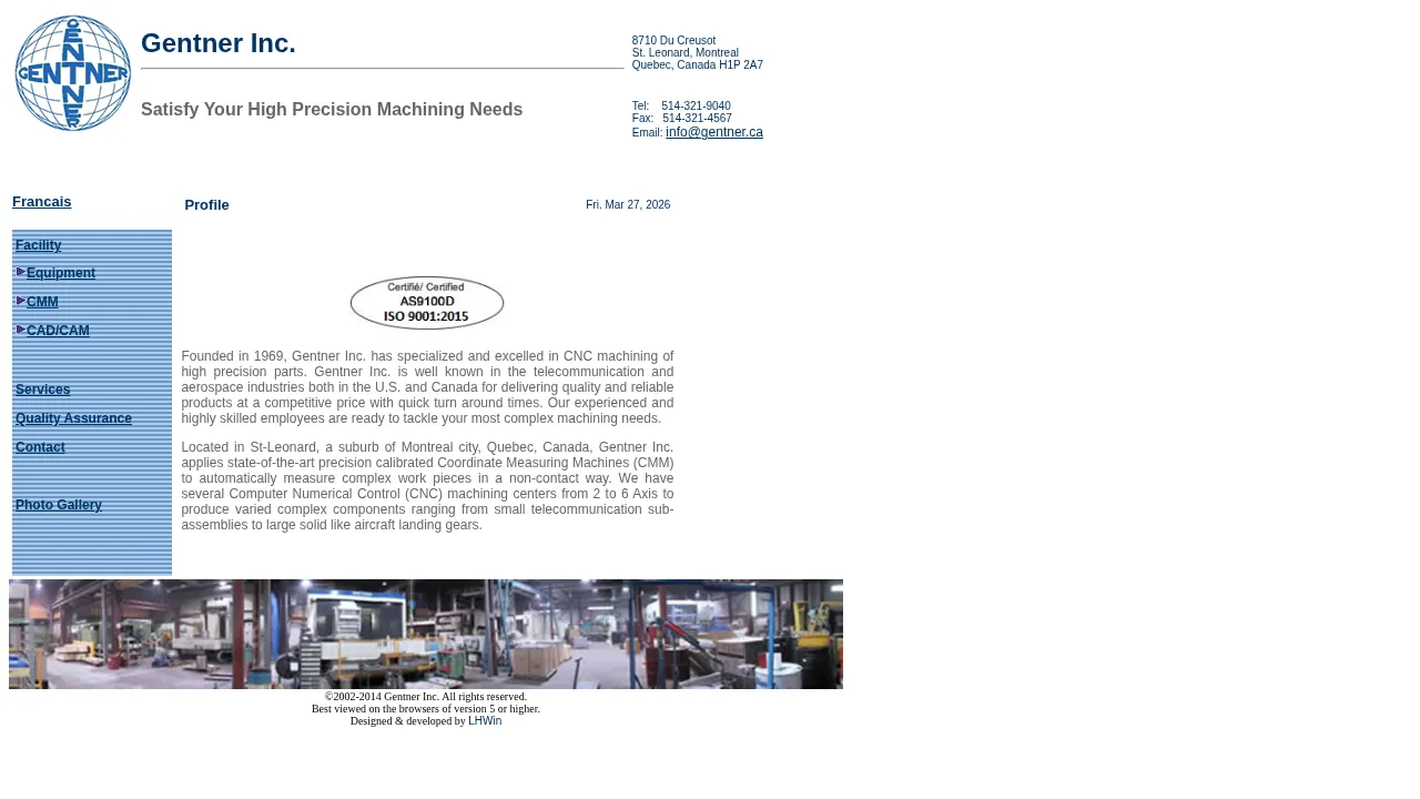 Established in 1969, Gentner Inc. is a precision manufacturing firm based in Montreal, Canada, specializing in advanced CNC machining. The company serves the aerospace and telecommunications sectors by producing complex, high-reliability components. Their manufacturing capabilities range from small sub-assemblies to large, durable parts using multi-axis machining technology. Gentner Inc. is recognized for maintaining competitive pricing, fast turnaround times, and stringent quality control standards. The company utilizes automated, non-contact measurement systems to ensure all parts meet precise technical specifications.