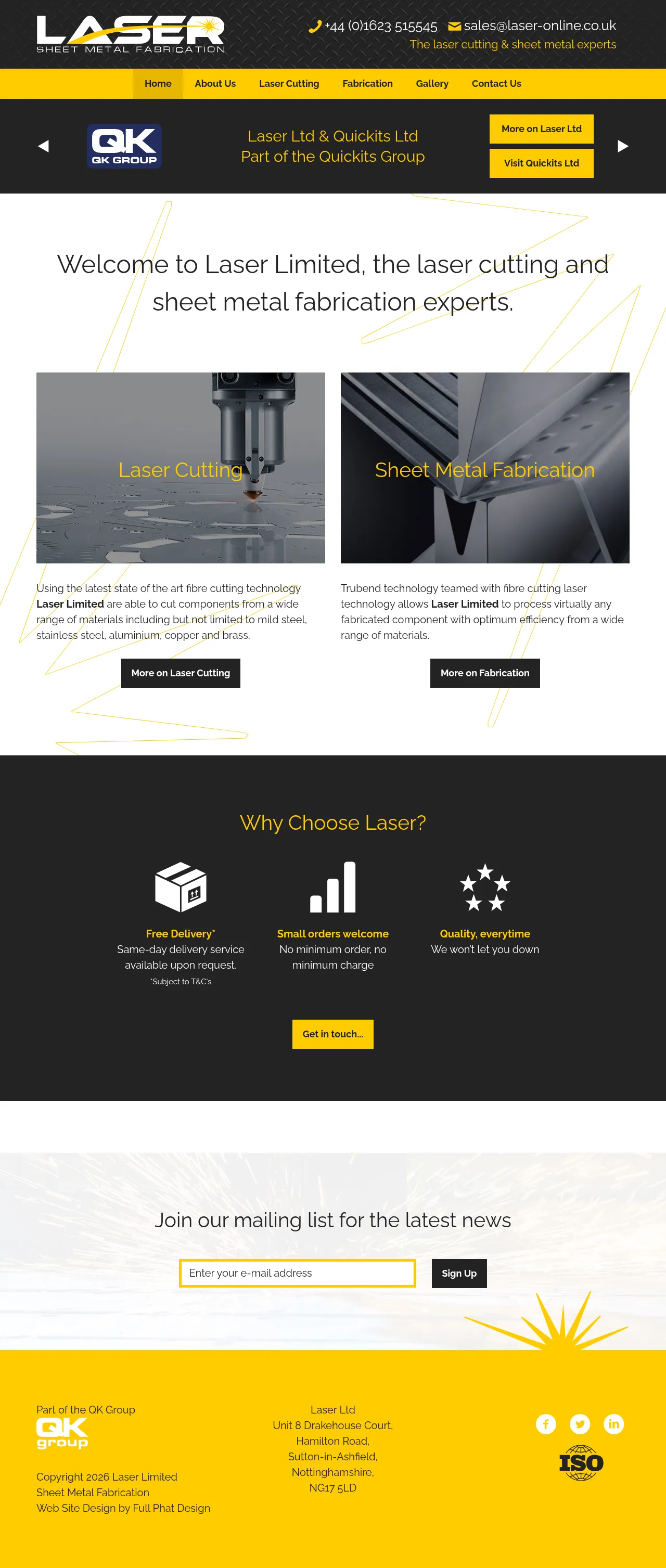 Laser Limited is a specialized provider of laser cutting and sheet metal fabrication services. Part of the QK Group, the company operates using advanced fiber cutting technology to process a diverse range of metal materials. They serve a broad client base by offering flexible order sizes with no minimum quantity or charge requirements. The firm emphasizes reliability and quality in its manufacturing processes, providing delivery services to meet project timelines.