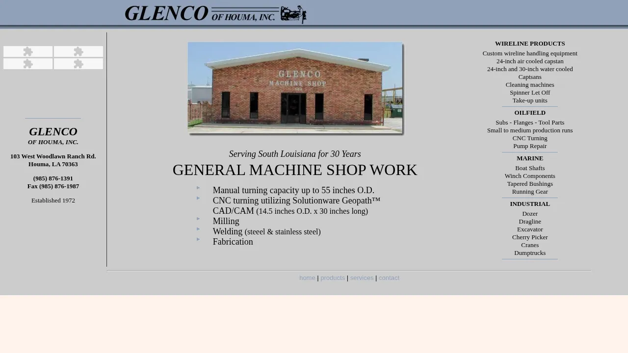 Established in 1972, Glenco of Houma, Inc. is an industrial machine shop providing precision manufacturing services to the oilfield, marine, and industrial sectors. The company specializes in the production of wireline equipment, machine parts, and custom fabrication. Capabilities include CNC turning, manual turning, milling, and welding, supported by advanced CAD/CAM software. Serving the South Louisiana region for over three decades, the facility handles both small and medium production runs alongside specialized repair services. Their expertise extends to boat shafts, winch components, and heavy equipment maintenance.