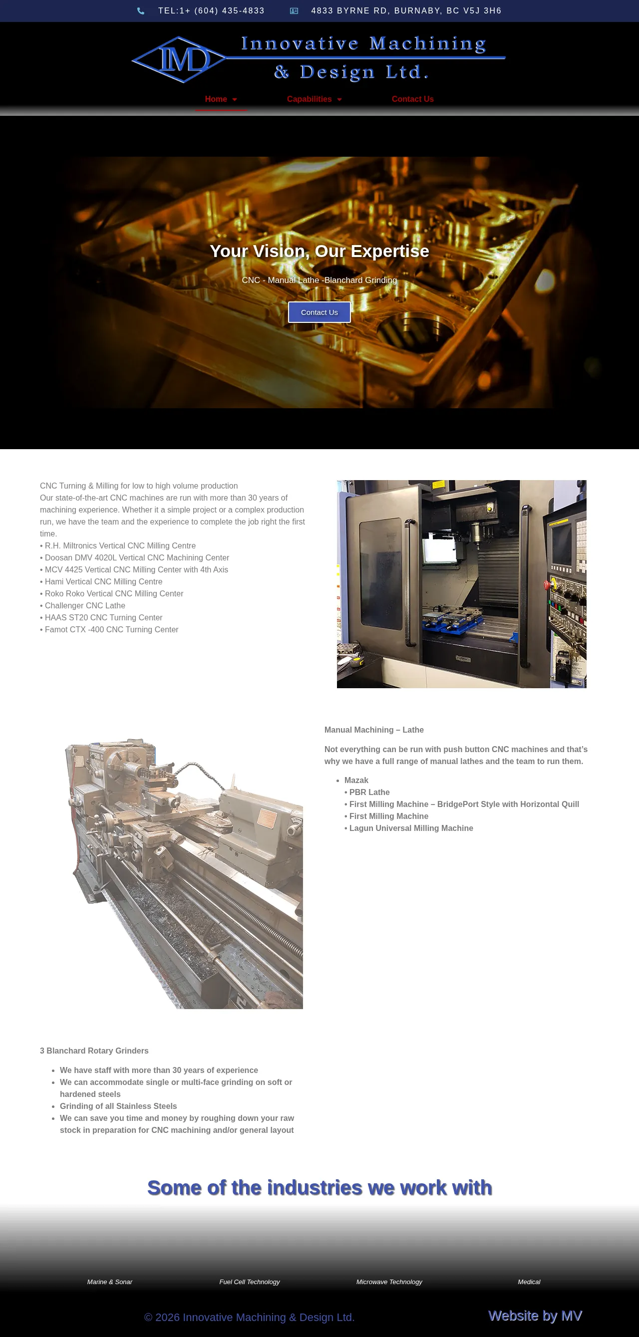 Innovative Machining & Design Ltd. (IMD Ltd.) is a precision machine shop established in 1998 and located in South Burnaby's Glenlyon Industrial Park. The company operates a 10,000 sq ft facility and provides CNC turning and milling, manual machining, Blanchard grinding, welding, and metal fabrication for prototype and production work. Its team has over 30 years of combined experience supporting industries such as marine/sonar, fuel cell, microwave technology, and medical sectors.
