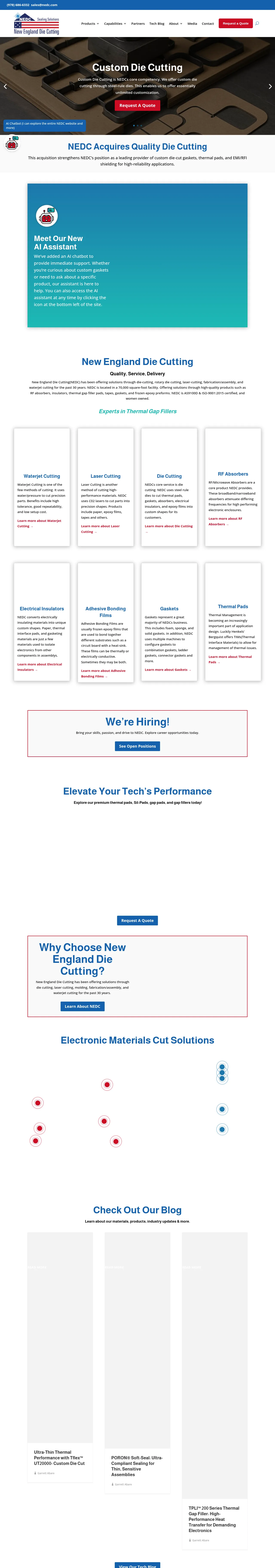 New England Die Cutting is an industrial manufacturer specializing in precision converting services for a diverse range of materials. Founded in 1982, the company provides custom die cutting, waterjet cutting, laser cutting, and fabrication solutions for applications including gaskets, thermal interface pads, and EMI/RFI shielding. They serve a broad spectrum of industries such as aerospace, military, medical, electronics, and automotive. The company maintains advanced quality standards and is equipped to handle complex material requirements and high-reliability specifications. By utilizing various cutting technologies and maintaining strategic partnerships with material suppliers, they provide tailored solutions for sealing, insulating, and thermal management needs.