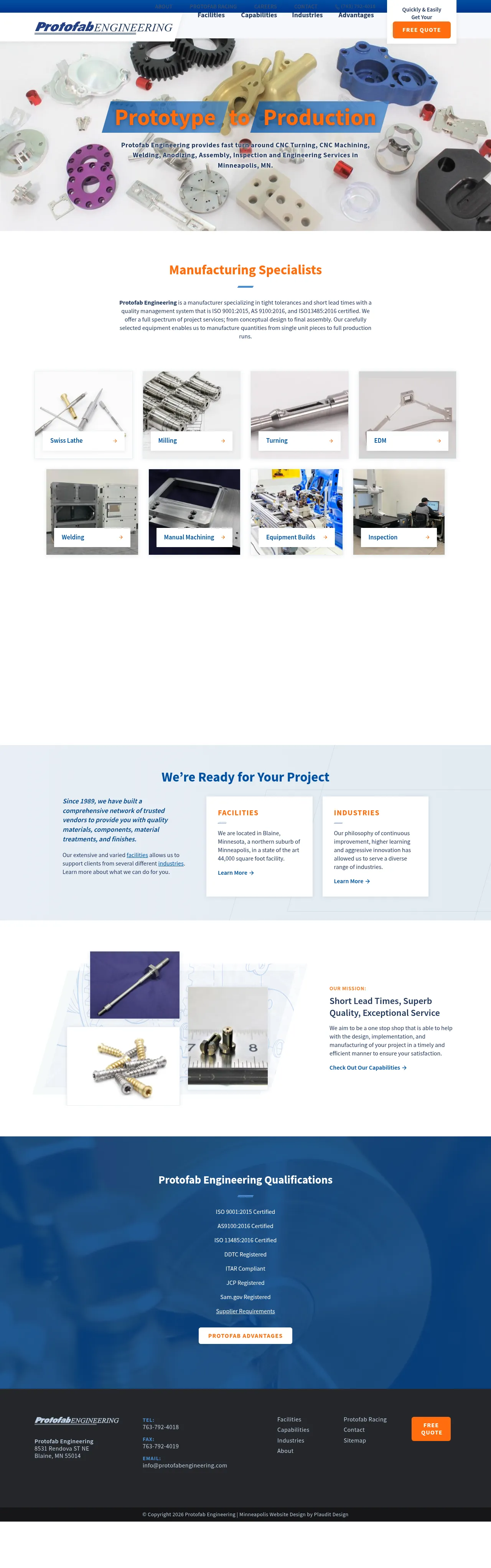 Protofab Engineering is a full-service manufacturing facility based in Blaine, Minnesota, operating out of a 44,000 square foot state-of-the-art facility. Since 1989, the company has provided comprehensive engineering, machining, and assembly services to a diverse range of industries. Their capabilities span precision CNC machining, welding, and electrical assembly, supported by a network of trusted vendors for material treatments and finishing. The company emphasizes continuous improvement and rapid production turnarounds to meet client needs from design through to final implementation. Their operations are strictly managed to maintain high quality and rigorous compliance standards.