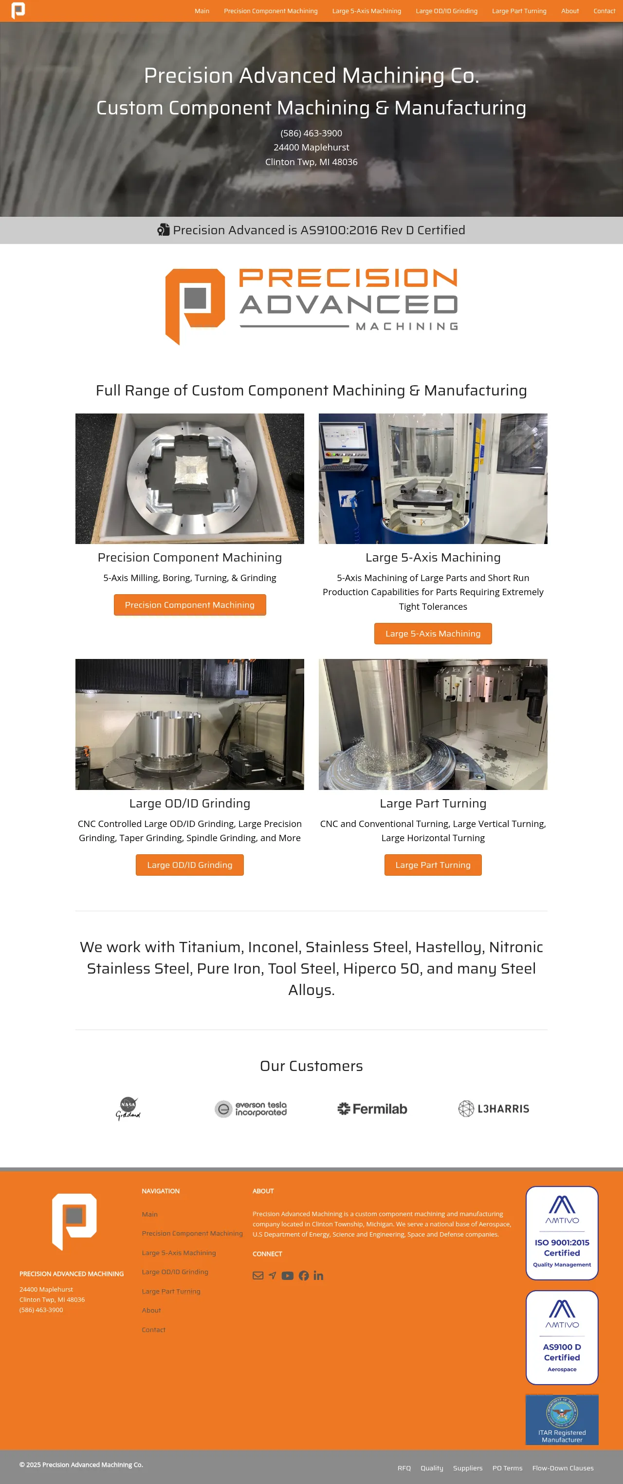 Precision Advanced Machining is a custom manufacturing facility based in Clinton Township, Michigan. The company specializes in high-precision machining and component manufacturing for the aerospace, defense, and energy sectors. Their technical expertise includes 5-axis machining, large-scale turning, and specialized grinding services. By maintaining rigorous quality standards, they support critical projects for science and engineering organizations. The company focuses on tight-tolerance production and complex geometry fabrication to meet exacting client specifications.
