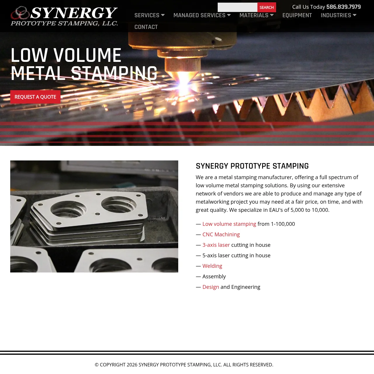 Synergy Prototype Stamping, LLC. is a contract manufacturer specializing in low-volume metal stamping, laser cutting, and CNC machining. The company supports industries including electronics, automotive, aerospace, military, and medical with high-precision components and assemblies. Their core capabilities range from custom fabrication and thermal treatment to advanced laser additive manufacturing and welding. Leveraging over a decade of experience, they provide engineering support from initial design and prototyping through to final production. They are recognized for delivering parts that meet tight tolerances and stringent performance specifications.