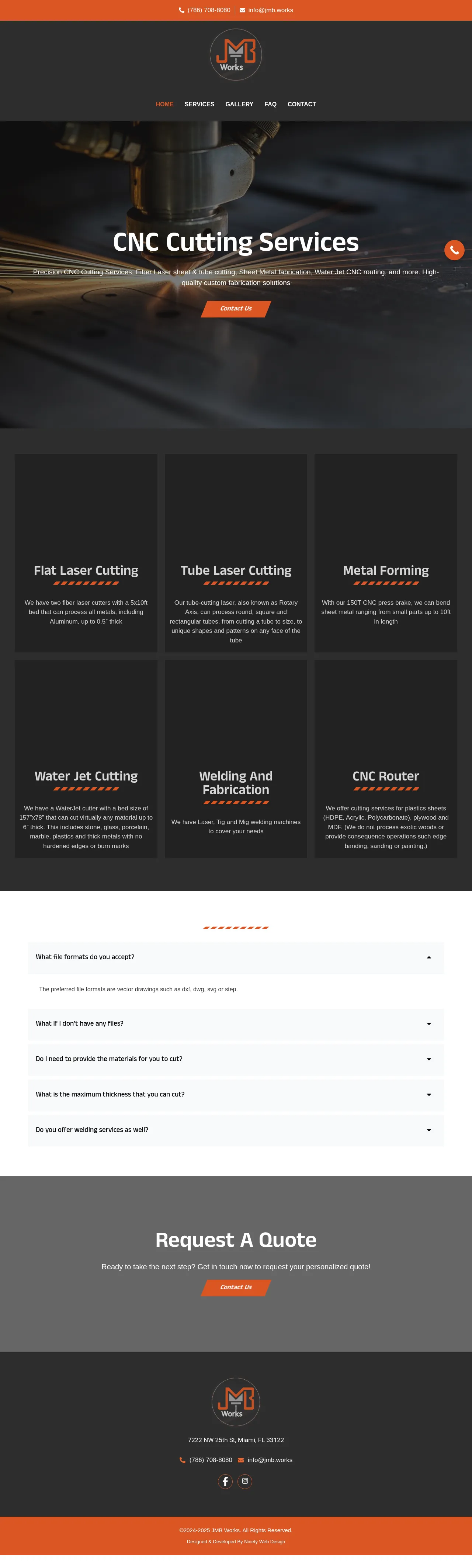 JMB Works is a Miami-based manufacturing facility specializing in precision cutting and fabrication services. The company provides fiber laser cutting, tube laser processing, waterjet cutting, and CNC press brake forming to handle a wide range of metal and non-metal projects. They support client production through in-house design assistance, converting sketches or varied file formats into production-ready technical drawings. While focused on integrated fabrication, they offer welding services specifically for parts manufactured within their facility. JMB Works serves diverse needs by processing materials ranging from aluminum and heavy-gauge metals to stone, glass, and industrial plastics.