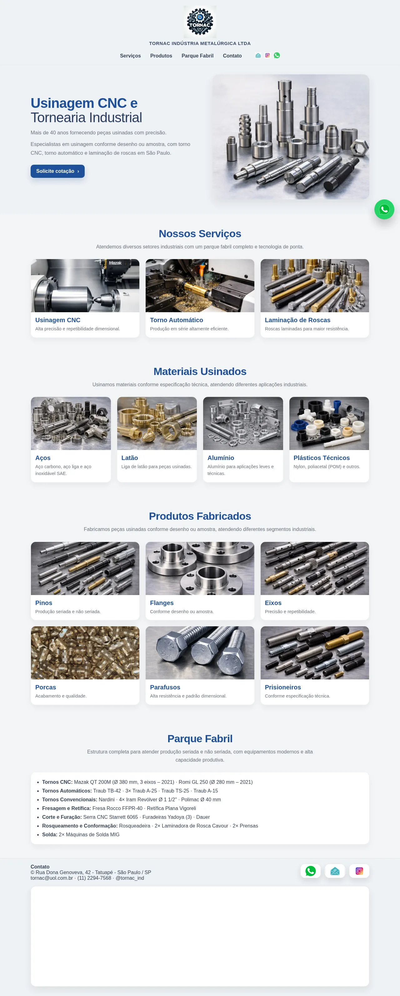 Tornac Indústria Metalúrgica LTDA is an industrial manufacturing firm with over 40 years of experience in high-precision precision machining. The company specializes in the production of machined parts based on technical drawings or samples, serving a wide range of industrial sectors. Its core capabilities include CNC turning, automatic lathe operations, and thread rolling. Utilizing a comprehensive facility equipped with modern technology, Tornac manages both serial and non-serial production runs. The company is committed to delivering dimensional precision, repeatability, and high-quality finishes across a variety of metallic and technical plastic materials.