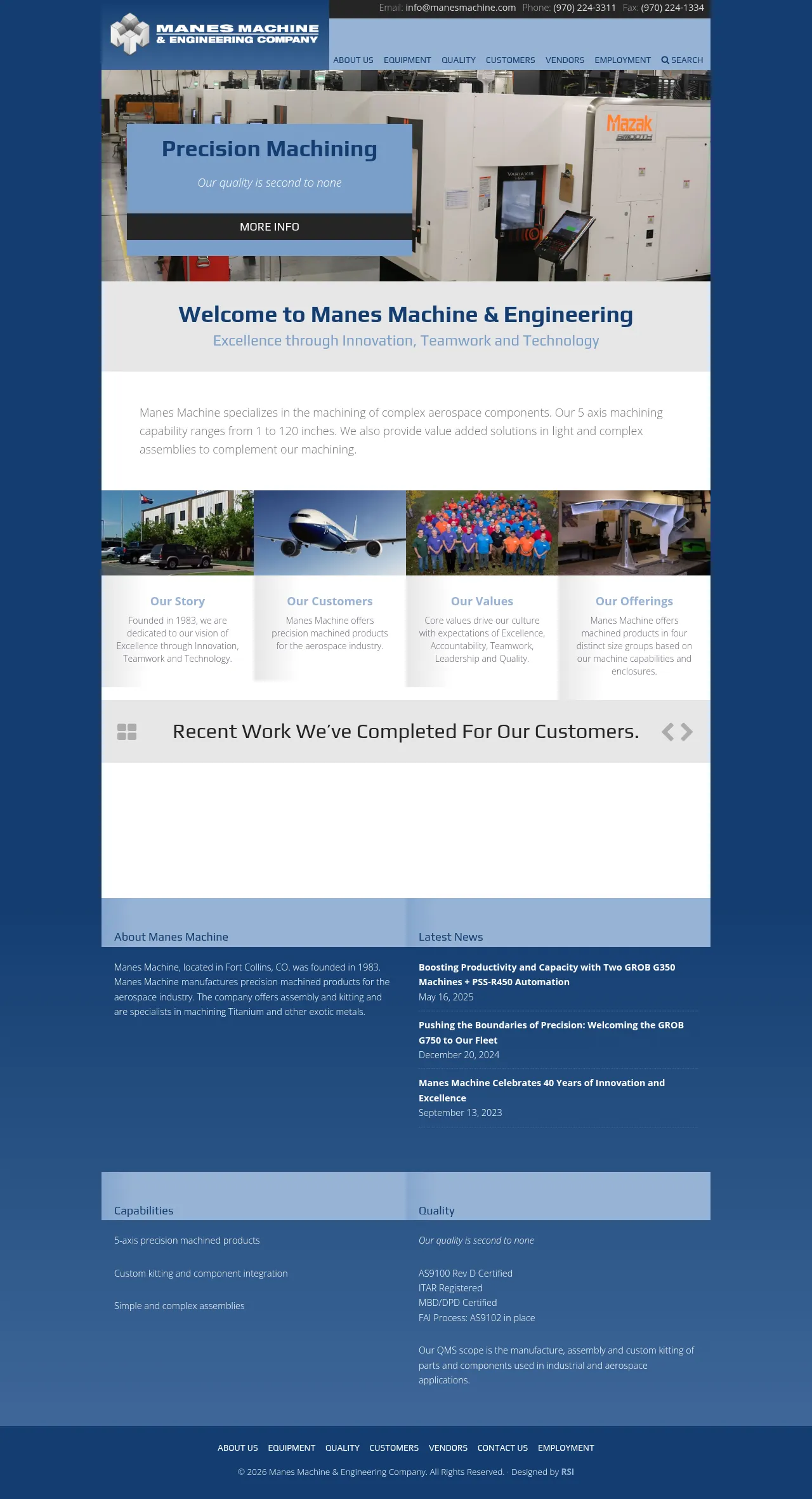 Founded in 1983, Manes Machine is a precision manufacturer specializing in the production of complex aerospace components. Based in Fort Collins, Colorado, the company provides multi-axis machining, light and complex assemblies, and custom kitting services. They maintain a particular focus on hard metals, including titanium and various aerospace alloys. Their manufacturing processes support industrial and aerospace applications, backed by advanced engineering capabilities and a commitment to quality. The company utilizes automated machining technology to optimize productivity and deliver high-precision parts.