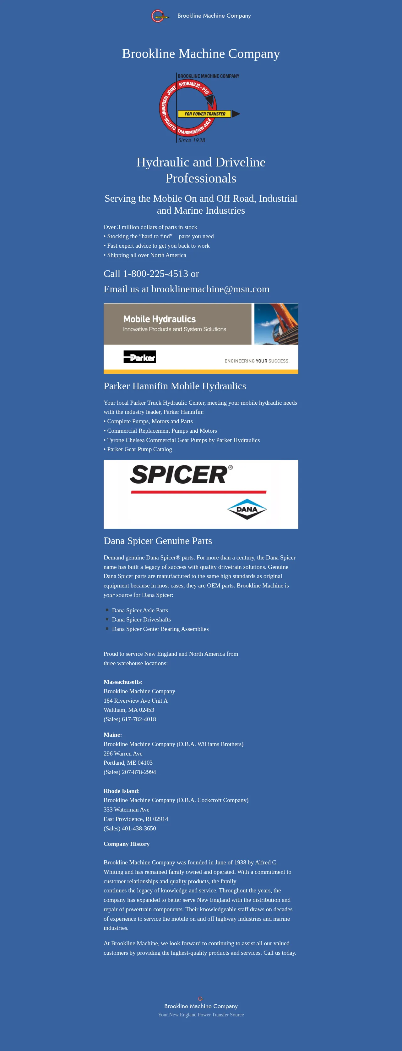Brookline Machine Company is a family-owned provider of power transfer and hydraulic solutions serving the mobile on-road, off-road, industrial, and marine industries. Established in 1938, the company specializes in the distribution and repair of powertrain components, including axles and driveshafts. As an authorized Parker Truck Hydraulic Center, they offer a comprehensive range of pumps and motors. With three warehouse locations across New England, they maintain a significant inventory of replacement parts to support regional and North American clients. Their operations focus on delivering technical expertise and rapid fulfillment for complex industrial power transfer requirements.