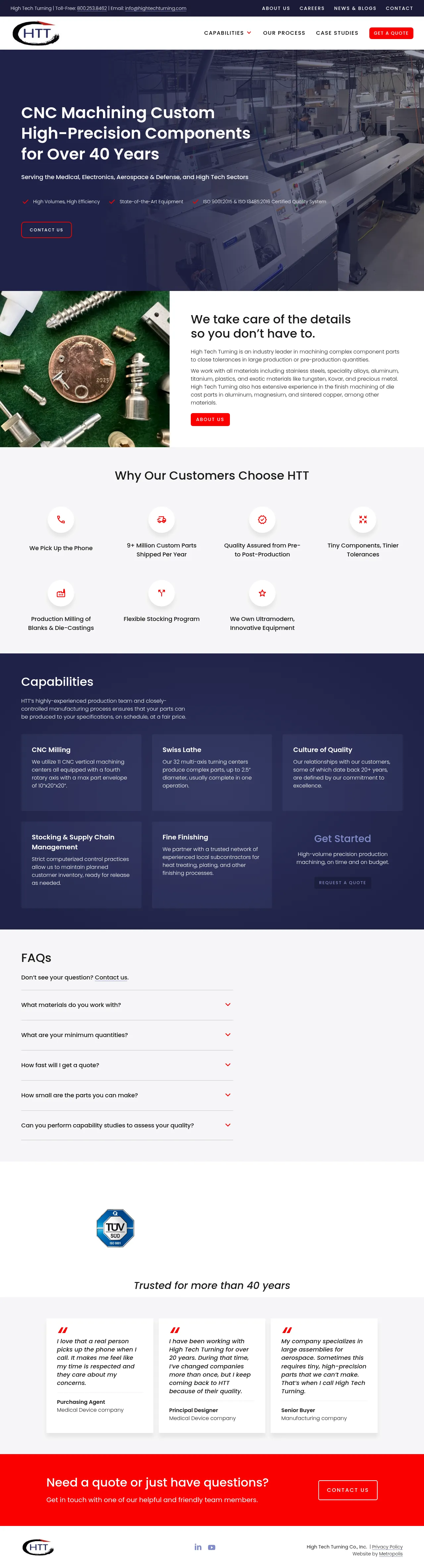 High Tech Turning is a precision manufacturing company located in Watertown, Massachusetts, specializing in high-volume CNC machining. Established in 1985, the company produces complex, small-scale components for various industries, with a significant focus on medical device manufacturing. Utilizing a 15,000-square-foot facility, they employ a "one and done" production approach to maximize efficiency and maintain tight tolerances on parts ranging from prototype quantities to multi-million part production runs. The company operates under ISO 9001:2015 and ISO 13485:2016 quality standards, supported by robust inspection protocols and long-term supply chain management services.