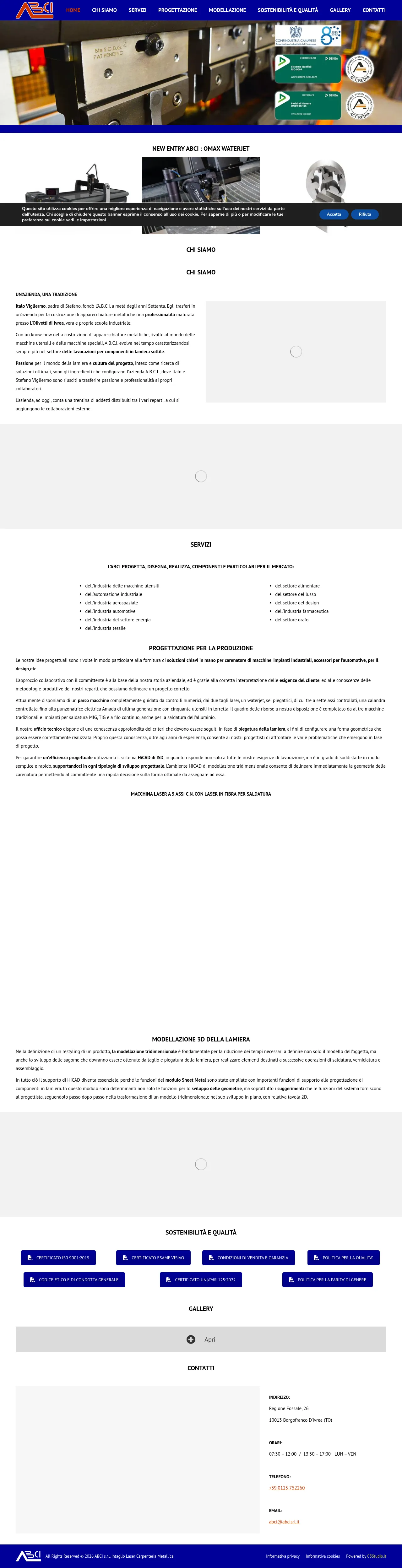 ABCI s.r.l. is an Italian manufacturing company specializing in precision laser cutting, sheet metal fabrication, and mechanical assembly. Serving industries such as automotive, aerospace, industrial automation, and medical, the company provides turnkey solutions ranging from design to final production. Their technical capabilities include 3D modeling, high-precision bending, and multi-axis machining. By leveraging advanced CAD software and a comprehensive fleet of numerical control machinery, ABCI translates complex design requirements into high-quality metal components. The firm maintains a strong focus on project culture and collaborative engineering to ensure technical accuracy and production efficiency.